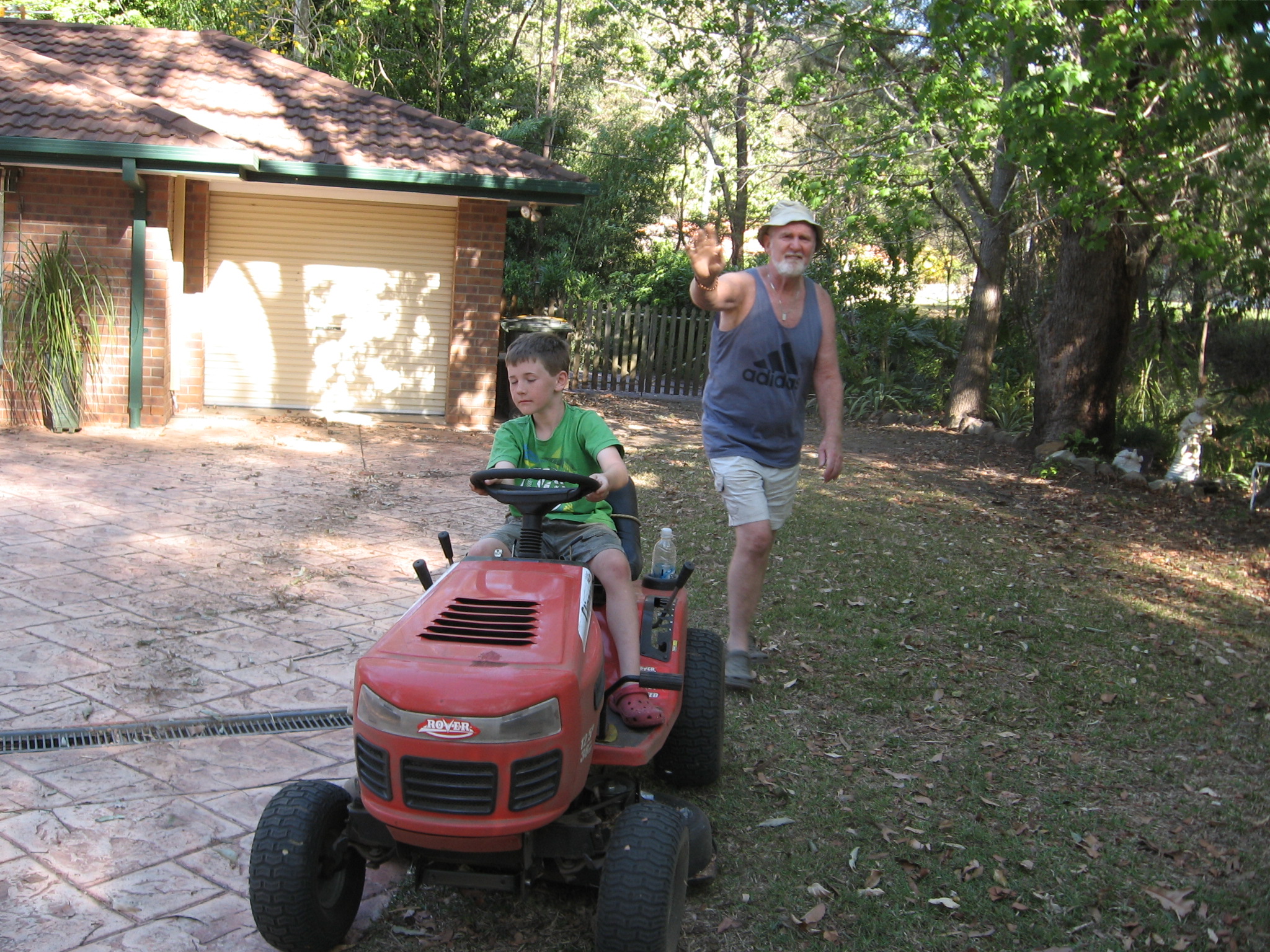 Bryson Johnston Driving the Ride-on Mower with Neal Supervising