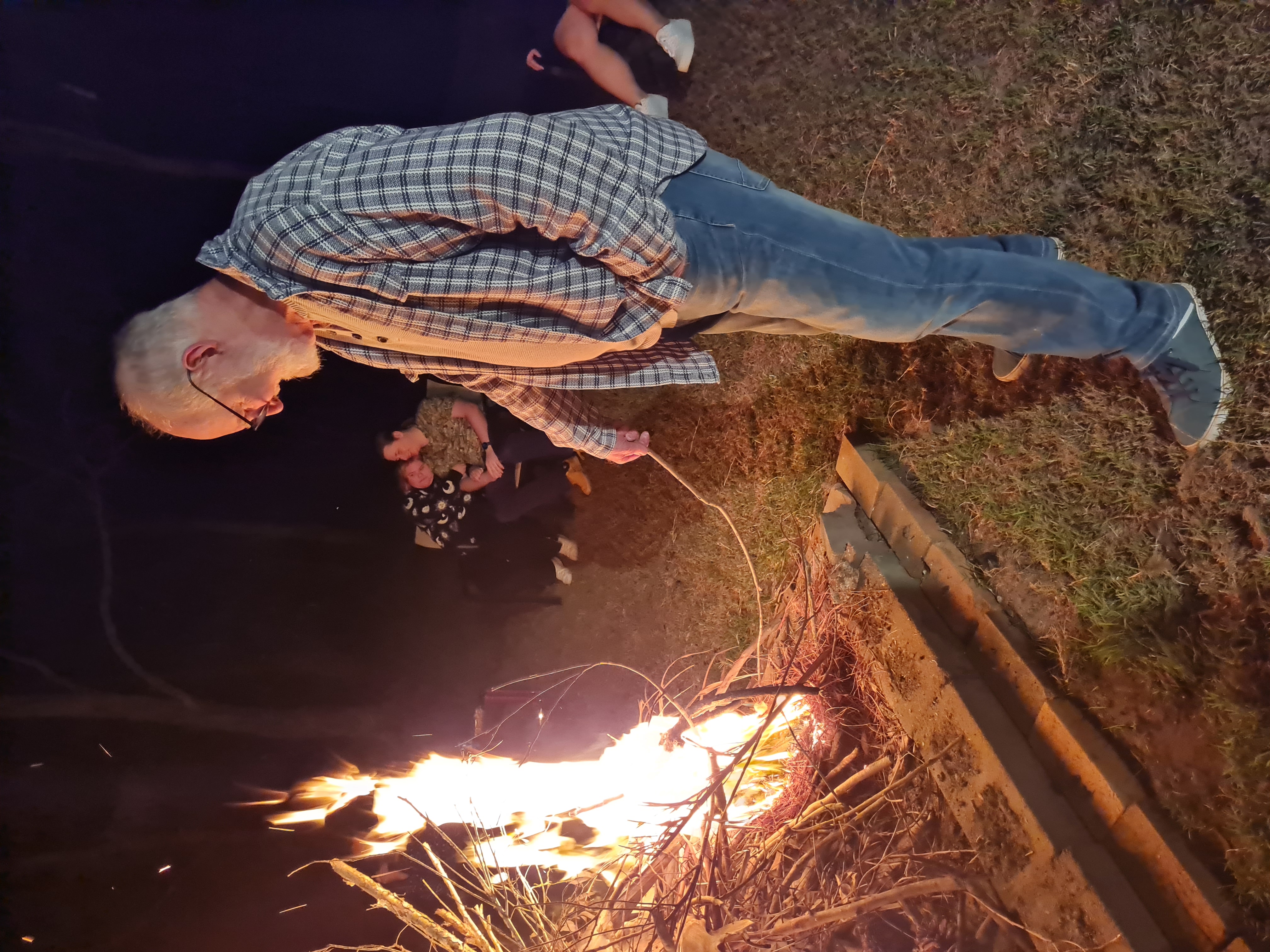 Neal toasting marshmello's in the bonfire with Bella & Tyler in the background