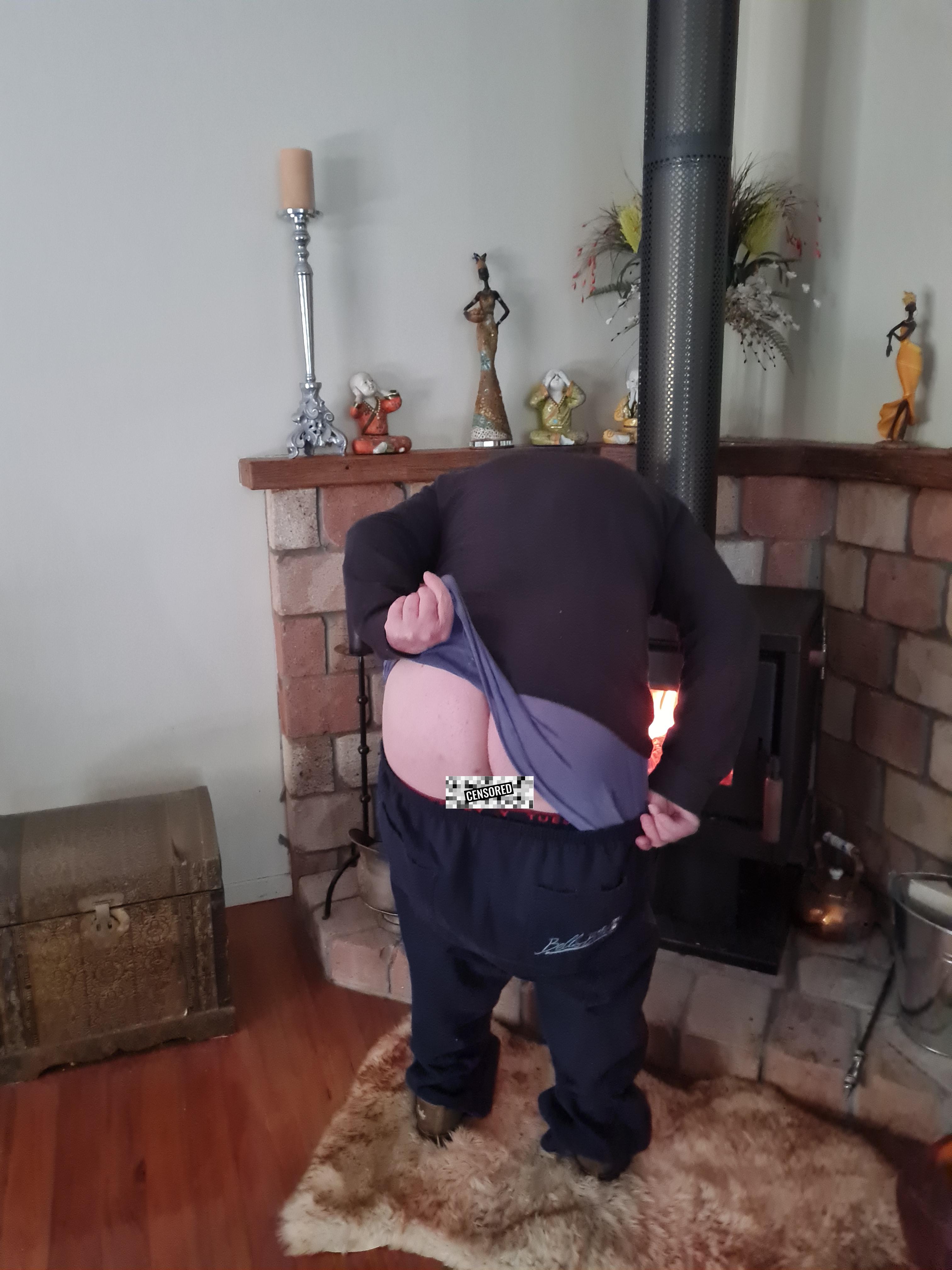 Neal's butt by the fireplace (Jacki egg'd him on to show his butt)